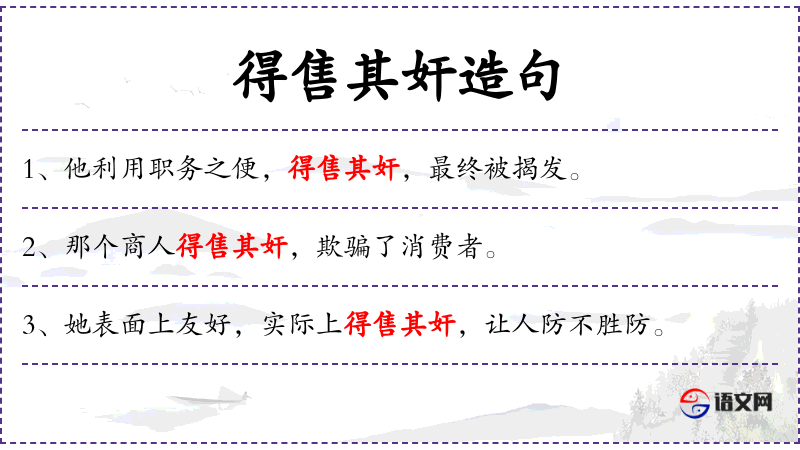 - 得售其奸:这个词组意味着某人成功地实施了欺诈或不诚实的计划。
