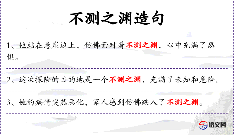 - 定语:充满了未知和危险(修饰“不测之渊”)
