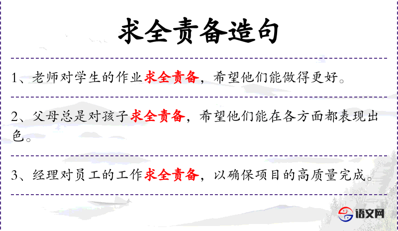 3. 【求全责备】 - 求、责:要求;全、备:完备,完美。对人对事物要求十全十美,毫无缺点。